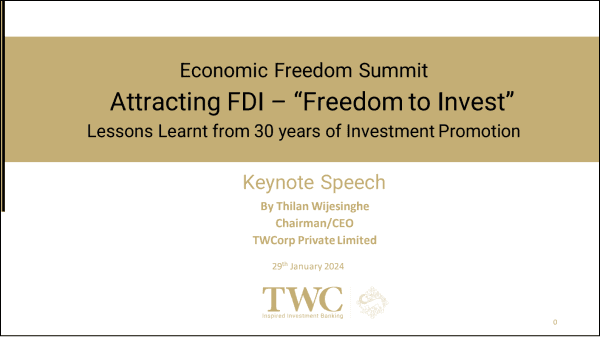 In a recent speech at the Economic Freedom Summit organized by Advocata Institute, Thilan Wijesinghe the Chairman of TWCorp shed light on the critical aspects of attracting Foreign Direct Investment (FDI) to Sri Lanka. Drawing on decades of experience in both the private and public sectors, he outlined key historical successes, current challenges, and proposed solutions to rejuvenate the country's investment landscape.